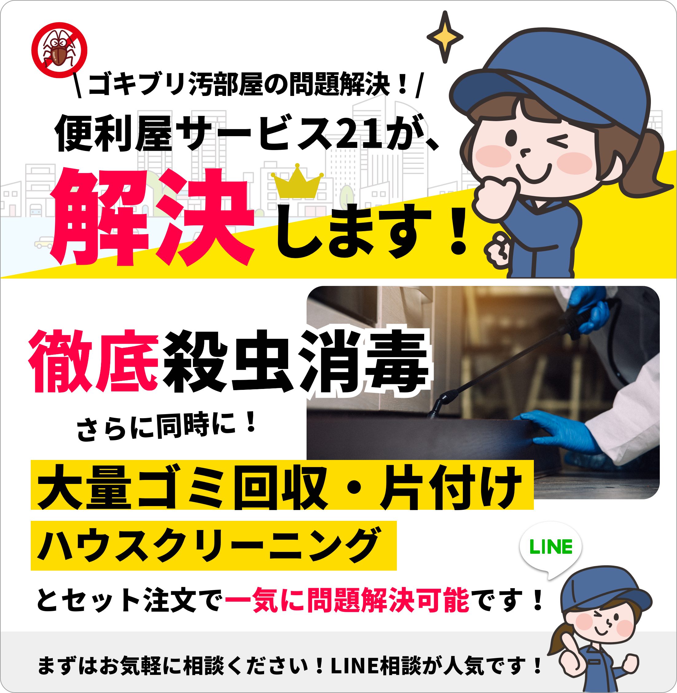 便利屋サービス21では、害虫駆除と汚部屋の掃除を一度にご依頼いただけます。
