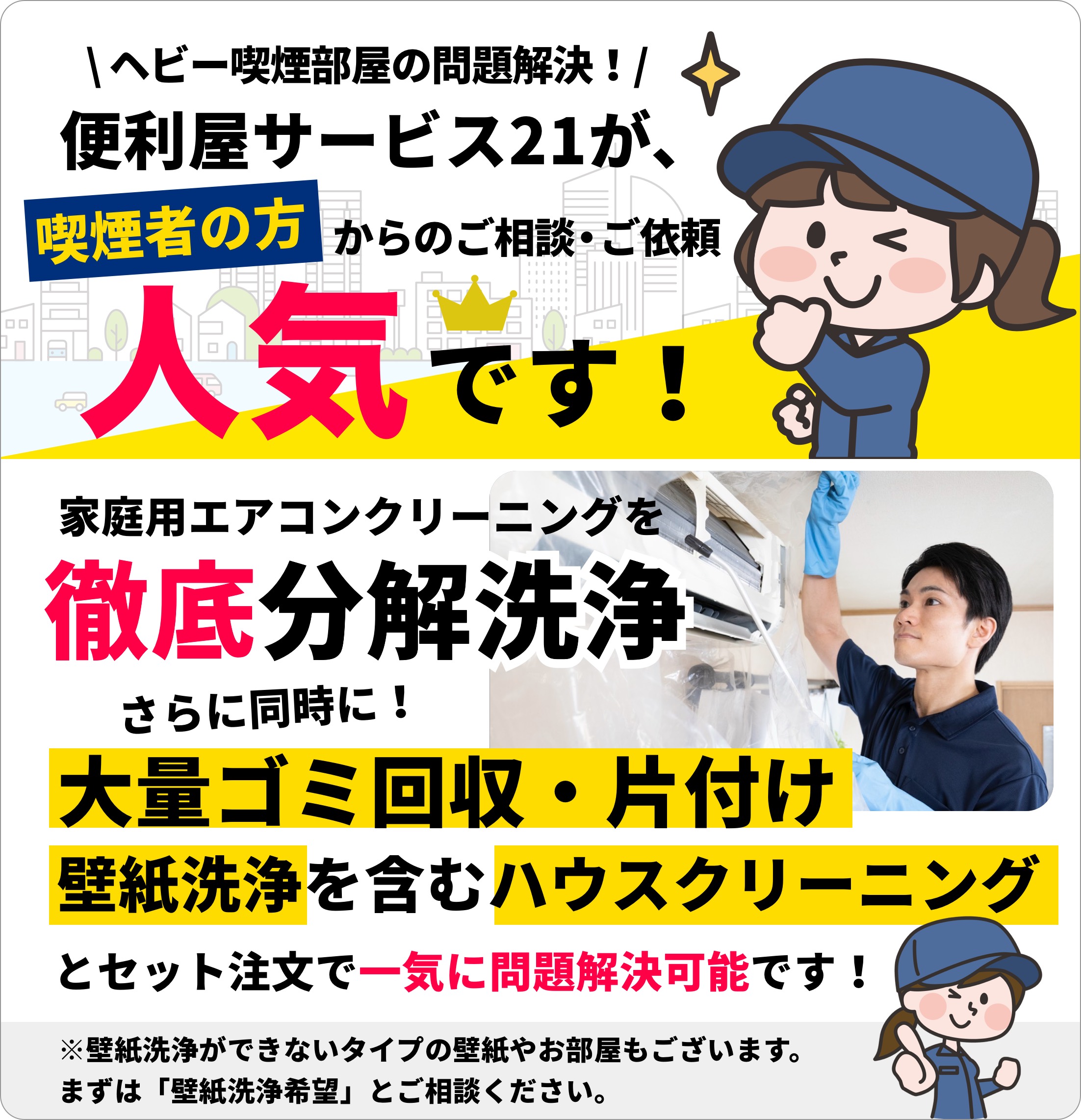 分割払い可能!東京・千葉・埼玉・神奈川の不用品の回収、汚部屋の片付け、エアコン掃除・エアコン取り外しは便利屋サービス21